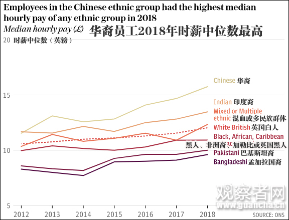 据英国《每日电讯报》网站当地时间7月9日报道,根据英国国家统计局(ONS)公布的2012年至2018年数据,在所有族裔中,华裔和印度裔员工的时薪中位数始终最高。