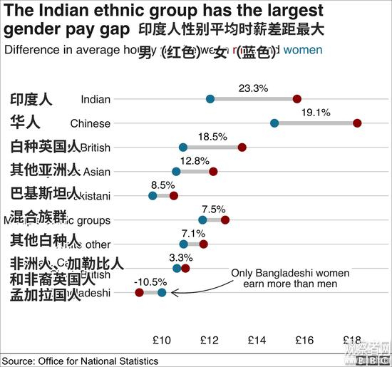 报告指出,其实从2012年起,华人和印度人的时薪就一直要高于英国白人。不过前两个族群存在一个相同的问题:性别收入差距太大。