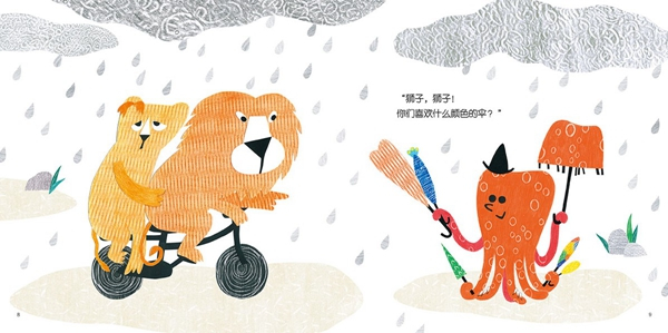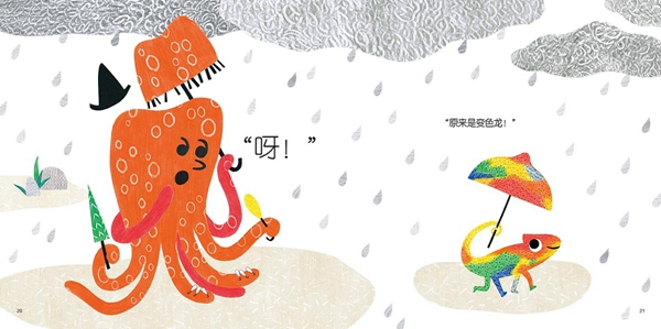 澎湃新闻:同样采取这样的创作手法,在《走出森林的小红帽》里确实如王晓明先生所说比较有紧张感、粗粝感,完全不柔和,但是到了《章鱼先生卖雨伞》里却没有这种感觉,显得明艳活泼,这完全是因为内容造成的吗?还是你在手法上有什么微调?
