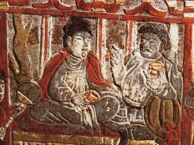 付承章:这部小说中提到了一些很有意思的器物,比如说有一个斜靠在毡毯上的胡人胖子,左手拿着高足杯。这个动作是比较还原历史情景的,因为在西安安伽墓的石屏甚至在中亚出土的壁画上都可以看到手持高足杯的人物形象。这种器物在隋唐时期的中国、突厥人的领地甚至乌克兰都有出现,它的源头可以追溯到希腊—罗马的器物上。可见高足杯在当时很多地方是非常受欢迎的,出现在长安更是不足为奇。