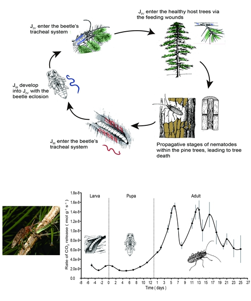 不同于模式秀丽杆线虫,松材线虫的传播是通过媒介昆虫——松墨天牛完成的。扩散型松材线虫通过天牛的气孔进入其呼吸系统,每头天牛可以携带数百至二十余万条松材线虫。松墨天牛羽化后飞到健康松树上取食松枝皮进行补充营养,达到性成熟后交配,到衰弱木上产卵。松材线虫则通过松墨天牛补充营养取食产生的取食伤口侵入松树。松树被松材线虫侵染后一般2-3个月后死亡。松材线虫从媒介昆虫-松墨天牛气孔溢出的机制一直是国内外学者未解的一个松材线虫生活史关键节点。过去一直猜测是某种化学信号诱导松材线虫从松墨天牛呼吸系统溢出,但都没得到验证。中国科学院动物研究所孙江华研究组的研究工作表明,松墨天牛通过补充营养增加了代谢和呼吸速率,进而导致松墨天牛气管系统内CO2升高,如同秀丽杆线虫中发现的Acute CO2 avoidance机制一样,一旦松墨天牛气管系统内CO2达到一临界值,松材线虫就开始从天牛气孔溢出。这一研究结果揭示了松材线虫传播和松萎蔫病侵染循环的一个关键节点,对进一步理解松材线虫复杂生活史和松萎蔫病防控具有借鉴意义。