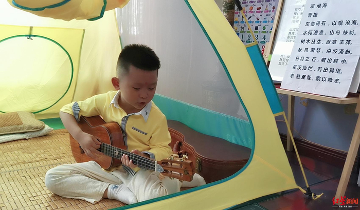 不仅能背古诗,小薪宇还会唱古诗。在读幼儿园小班的他,有一次老师布置作业,要求完成一首儿歌的演唱,很多小朋友唱的是《小兔子乖乖》,而他唱的却是曹操的《观沧海》。面对红星新闻记者的镜头,小家伙唱出了磅礴气势。