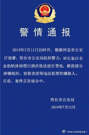 据河北邢台市公安局官方微博7月12日下午通报,7月11日22时许,根据河北省公安厅部署,邢台市公安局组织警力,对石家庄市金伯帆休闲假日酒店依法进行查处,抓获部分涉嫌组织、容留卖淫等违法犯罪的嫌疑人。
