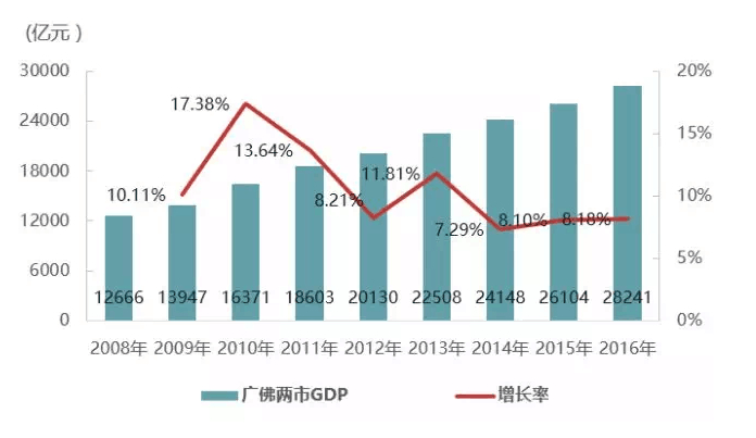 以广佛为例,从2009年签署《广佛同城化建设合作框架协议》至今已有10年。从两地人员流动来看,广佛地铁2017年客流量1亿人次,预计2019年客流量约2亿人次。从经济体量来看,去年广佛经济总量(GDP)合计3.3万亿元,超过城市排名第一位的上海。这显示广佛已高度融合。