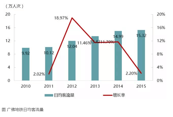 广佛同城化就是以首条跨市地铁——广佛地铁为先导,带动候鸟人群的形成。《广佛同城发展报告2018》显示,从2010年的日均9.92万人次增长到2015年的日均15.32万人次,年均复合增长率为9.08%,日均客流量5年增幅超五成。地铁成为广佛同城化加速器。