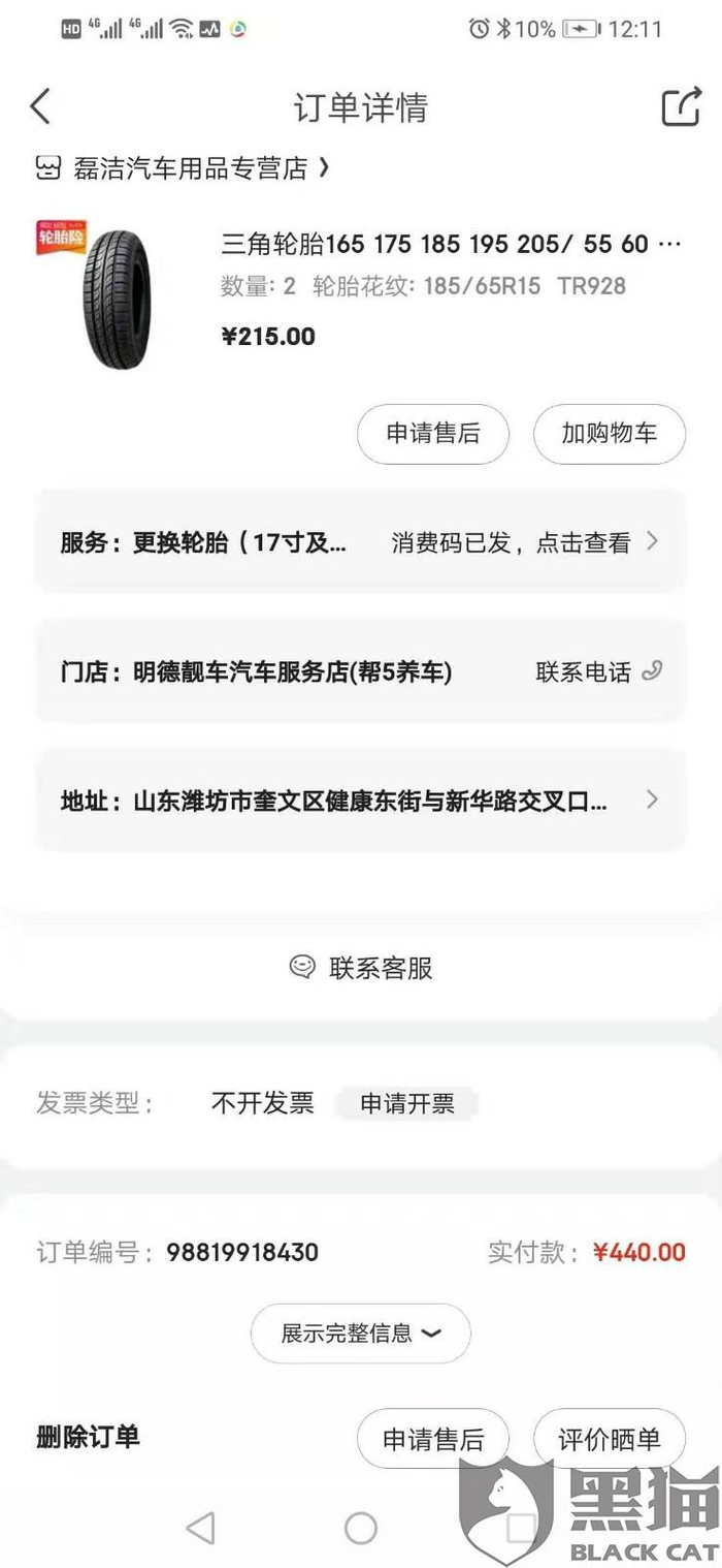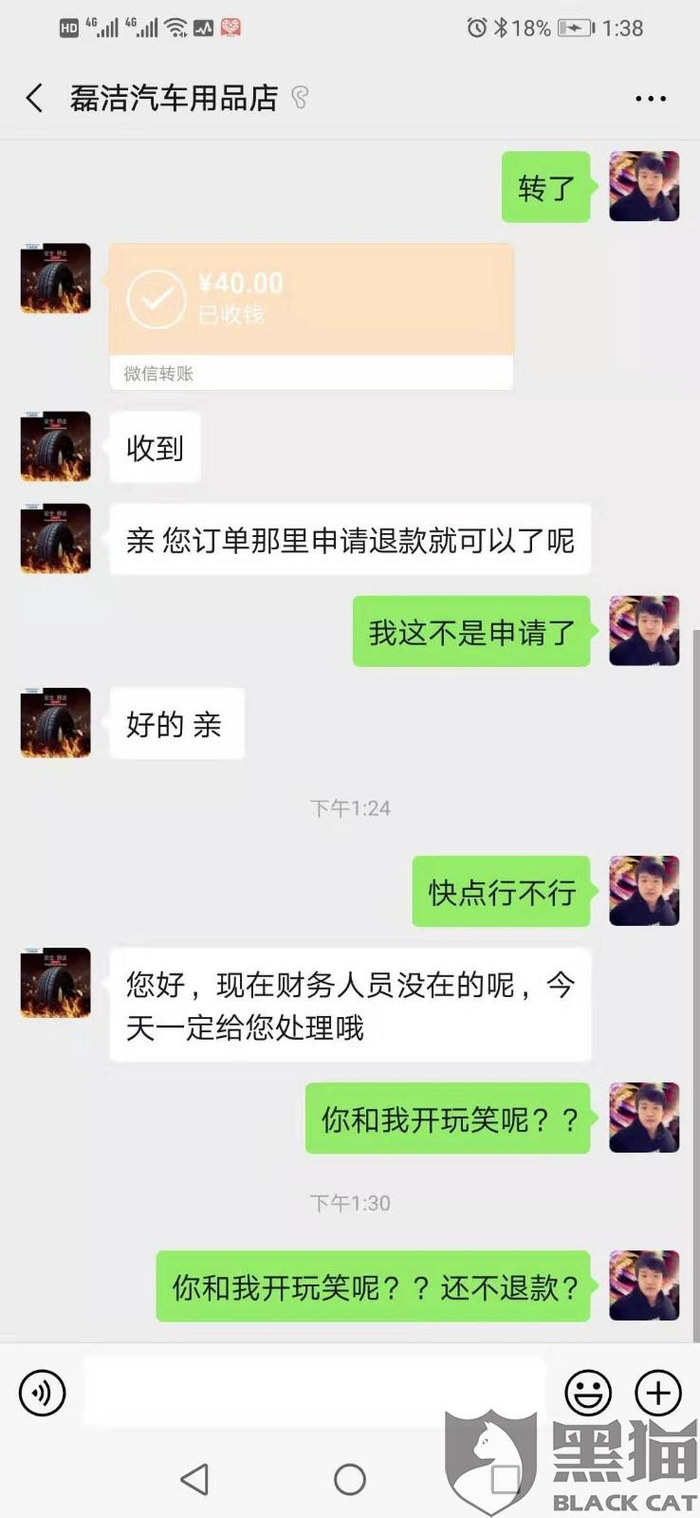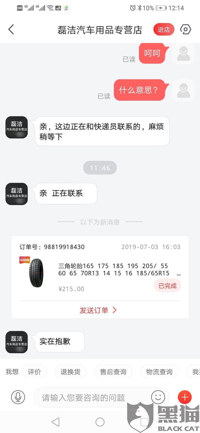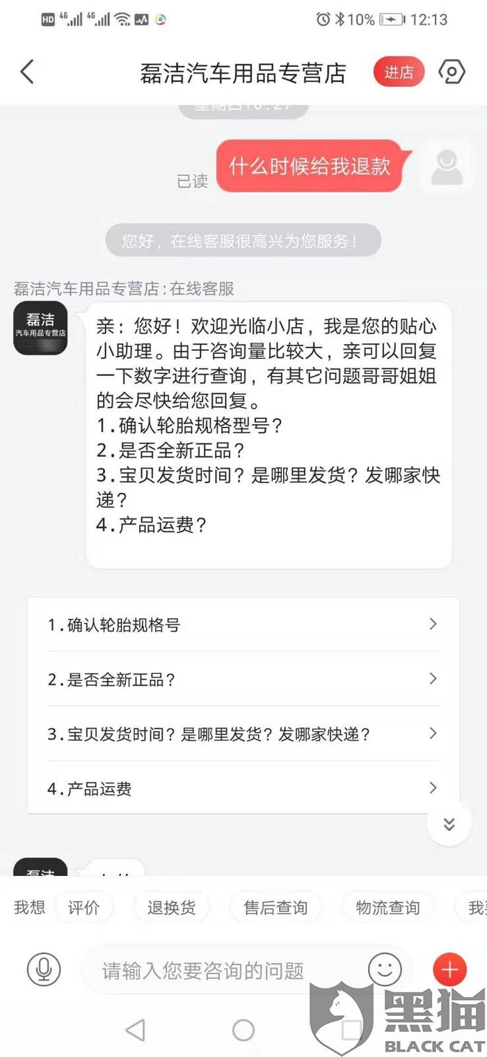 黑猫投诉:在京东第三方卖家买的2个三角轮胎,选择七天无理由退款,退回货物后拒不退款