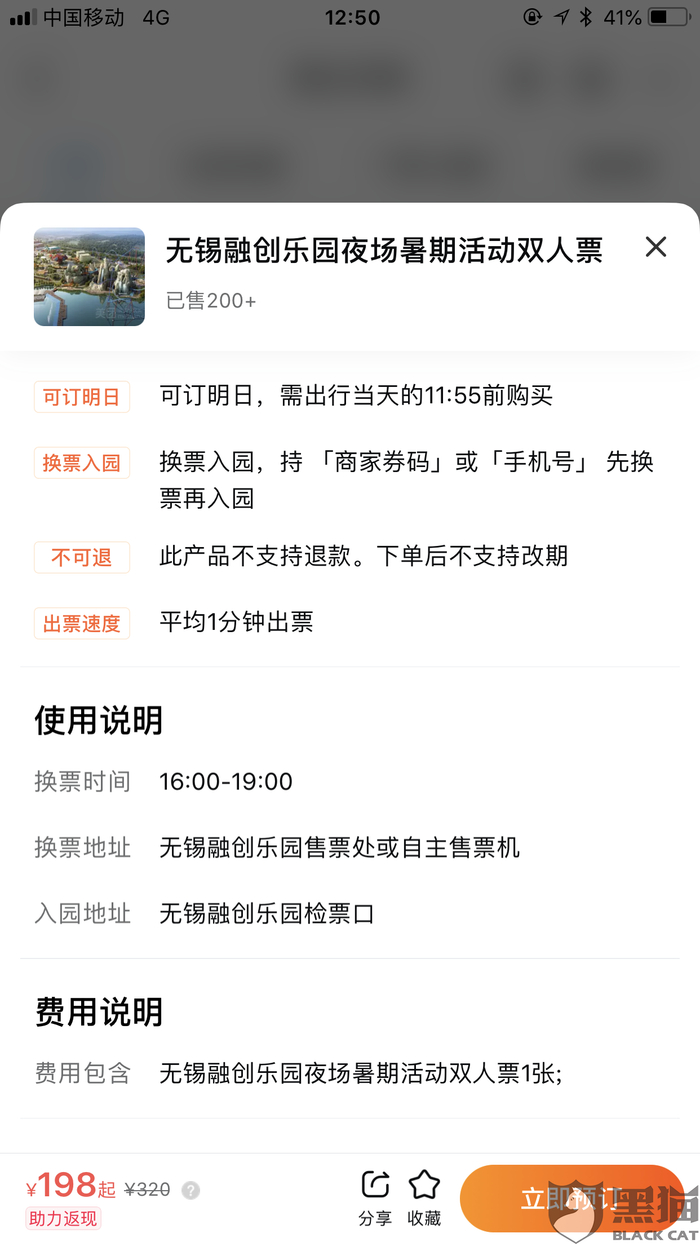 消费者“我是你的将来2333”在7月13日向黑猫投诉平台反映:“2019.7.12上午8点多我在美团买了融创乐园夜场双人票,198元,下午3点多我们到了乐园门口,可是雨越下越大,很多想要的设施都关闭了,买的票显示不可退,然后旁边有个特殊情况申诉,自然灾害可以申诉,我就进行申诉了,一直在申诉中,没人解决,我就先回去了,当天一直在申诉中,没人解决!到了第二天直接订单就变成评价中了,然后我打了美团的客服电话,说去跟商家协商,然后说商家态度坚决,不退票!我买了票没有进去玩,而且因为天气原因申请的退票,商家当天没有处理,第二天跟我讲票过期了,而且我让他协商给我再换两张票也可以,给我回答也不可以!如果当天给我说就是没法退没法改我也接受了,当天也没给我解决,美团还说给我99元充值卡,我买的198的票没用,而且是因为商家处理不当,为什么我要接受?情求帮忙监督处理,谢谢!”