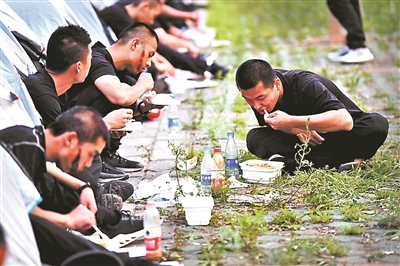 晚饭时间,特警队员坐在帐篷前吃着自热米饭