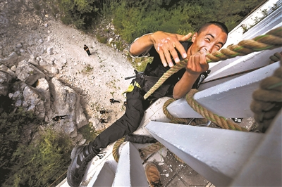 这一科目中每组成员需要利用坐滑姿势下滑至桥下,再利用绳索攀爬至桥面。在攀爬过程中,北青报记者看到特警队员的双腿紧紧夹住绳索,手脚并用向上爬。