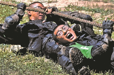 “这个科目十分考验队员的耐力,因为人一旦负重,体力消耗特别快,对身体会有压迫感。”魔鬼周教官告诉记者,“这个项目也需要队友之间的互相协作,一小组5个人,他们需要相互配合,共同完成任务。”