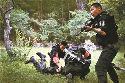 特警队员在进行山地搜索科目中,抓获“嫌疑人”