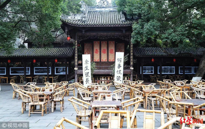 书香、茶香,琴之韵律、瓷器之美,在这交织成独属于成都的味道:智识、闲适与自由。陈锦茶铺卧在铁像寺红墙的一侧,戏台背靠铁像寺而搭,台下是一个大院坝,被密密麻麻的竹编圈椅所占领。桌椅之间,选了显眼之处,立了牌子,或曰“常来谈点大事的地方”,或曰“余生很长,何事慌张”。