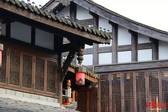 千高原对面的西蜀画院,整个建筑古香古色,木质雕栏,飞檐翘角,在夜幕里,灯火通明。作为中国历史上第一个宫办画院,西蜀画院在水街的夜晚里,是高调的。