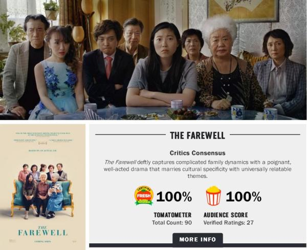 此外,由独立电影公司A24负责发行的《别告诉她》(The Farewell)上周末在全美四家影院开始做小规模上映,结果拿下超过35万美元票房,平均单厅的开画成绩有87833美元,在2019年至今所有北美开画新片中排第一位。《别告诉她》早先在今年圣丹斯电影节上已赢得观众最喜爱影片大奖,目前在“烂番茄”上保持百分百好评率。该片由华裔女导演王子逸(Lulu Wang)自编自导,她根据自己的亲身经历出发,讲述了一个美国华人家庭中,奶奶罹患癌症后发生的悲欢离合。《别告诉她》将会在8月2日推开到全美各地大范围上映,能否复制去年《摘金奇缘》的票房成功,值得期待。