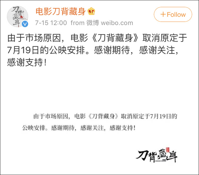 今天(7月15日)中午,电影《刀背藏身》官方微博宣布:由于市场原因,电影《刀背藏身》取消原定于7月19日的公映安排。