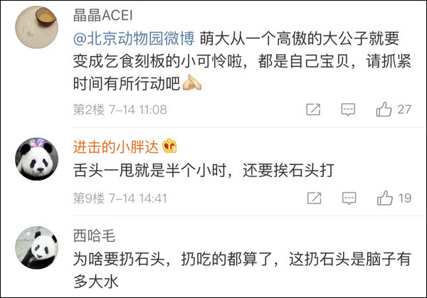 7月14日,网友@我是个小熊精 发布博文称,自己在北京动物园观看大熊猫“萌大”时,短短半小时内竟然先后有两人朝熊猫扔石头。