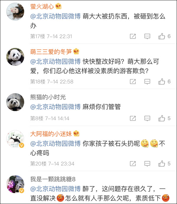 视频上传后,这种不文明不爱护动物的行为也激怒了不少网友,许多熊猫粉丝还@北京动物园微博 ,希望园方加强管理保护熊猫,尤其是对存在相关设计缺陷的场馆进行改善修建。
