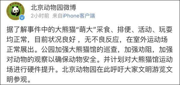 原标题:北京动物园回应游客砸熊猫:目前状况良好,园方加强巡查