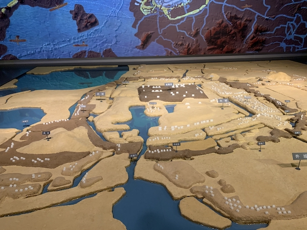 展览现场以沙盘形式复原了良渚古城。良渚古城的内城面积大约3平方公里,外城约6.3平方公里,外围水利系统受益面积近100平方公里。古城总人口约28000人,古城及外围水利系统土石方总量1000余万方。