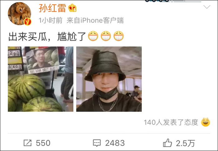 今天(7月16日)下午,孙红雷在微博上更新动态,称自己出门买瓜,结果“尴尬了”。