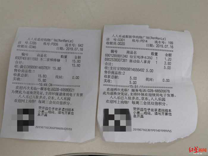 为了验证是超市该店单方面行为还是其他人人乐超市都有这一规定,7月15日,周先生又在人人乐超市(前锋店)购买商品,这一次,购物小票背面却没有印章。同一天,周先生再次来到人人乐超市(新华店),这回,他注意到,在收银台结账时,收银员在打印好的小票背面盖上了印章。