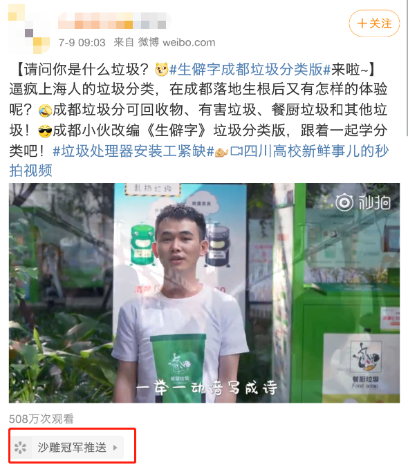 原标题:他的《生僻字垃圾分类成都版》爆红,却被微博标记“沙雕冠军”