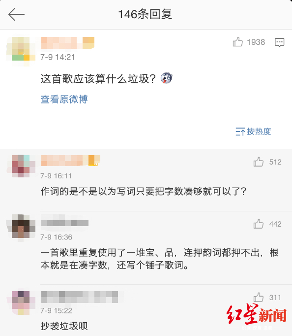 一则得到了1938次点赞的评论说道:“这首歌应该是什么垃圾?”有人继续评论说:“作词的是不是以为写词只要把字数凑够就可以了。”还有人说:“连押韵词都押不出。”