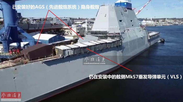 更近一些的航拍视频显示了更多细节,可见舰上2门“先进舰炮系统”(AGS)隐身舰炮已安装到位,其中一座炮塔还将155毫米舰炮竖起。但位于舷侧的80单元Mk57垂发导弹系统(VLS)仍被工棚所覆盖,仍在施工中。艏楼建筑也尚未安装其他电子设备。图为视频中显示的“约翰逊”号施工状态。