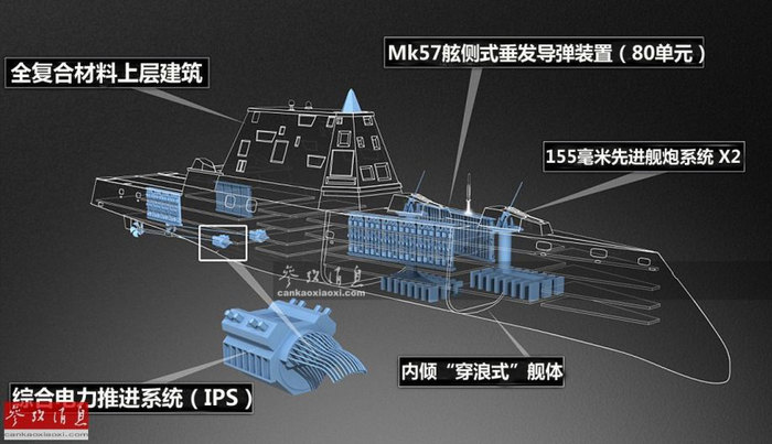 图为朱姆沃尔特级的舰载武器系统(2座155毫米AGS隐身舰炮和80单元“舷侧垂发导弹系统”)与“综合电力推进系统”(IPS)示意图,舰上还搭载有2座30毫米Mk46速射炮担当“近防炮”作用。