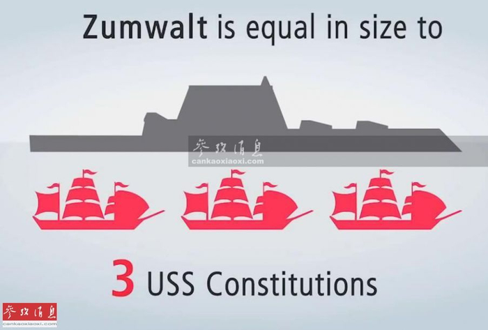 根据美军官方公开的资料, 朱姆沃尔特号全长182米,满载排水量近1.5万吨。由于采用了最新的综合电力推进系统,美军计划在该舰上搭载电磁轨道炮和高能激光武器。“朱姆沃尔特”号隐身驱逐舰的穿浪体外形科幻味十足。