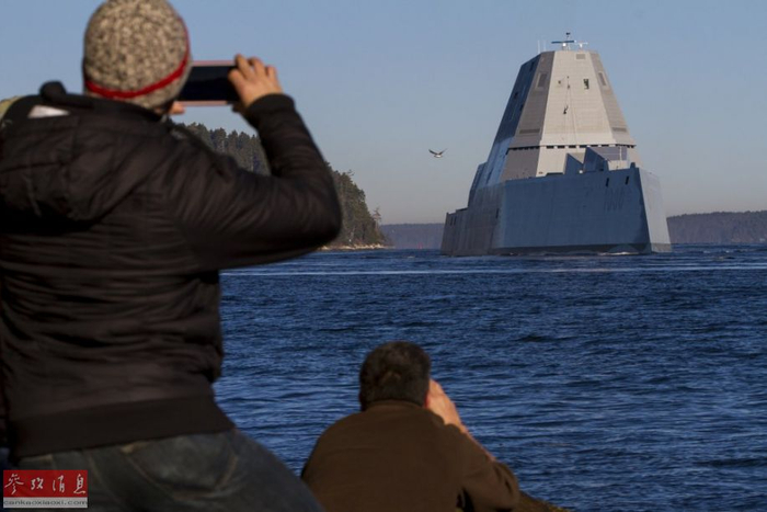 美国《星条旗报》网站12月7日报道称,新美国基金会的资深研究员彼得·辛格说,“朱姆沃尔特”级战舰关注的重点不是打击“伊斯兰国”组织,而是在太平洋阻遏中国。“图为12月7日,“朱姆沃尔特”号隐身驱逐舰首次出厂海试。