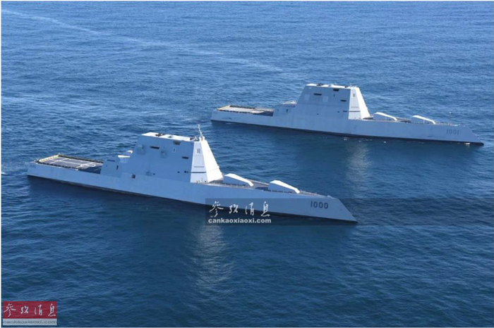 目前, 朱姆沃尔特级隐身战舰已有2艘投入现役,1号舰“朱姆沃尔特”号(DDG-1000)于2013年10月下水,2016年10月服役,2019年3月,该舰开赴加拿大进行首次海外部署。2号舰“迈克尔·蒙苏尔”号(DDG-1001)于2016年6月下水,2019年1月服役,目前仍处于训练和测试阶段。图为2艘朱姆沃尔特级编队航行资料图。