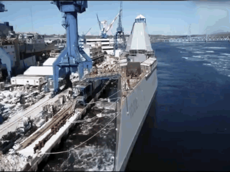 航拍仍在舾装中的三号舰“约翰逊”号(DDG-1002)以及海试中的二号舰“蒙苏尔”号(DDG-1001)动态图。
