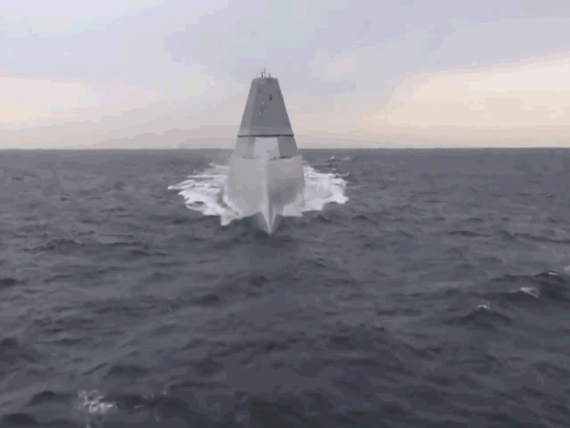 作为美海军未来战舰象征的朱姆沃尔特级隐身驱逐舰,是近年来的热门装备之一,图为正在进行高速转向测试的“朱姆沃尔特号”(DDG-1000)。