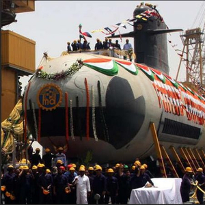 资料图片:印度国产虎鲨级柴电潜艇下水现场图。(图片来源于网络)