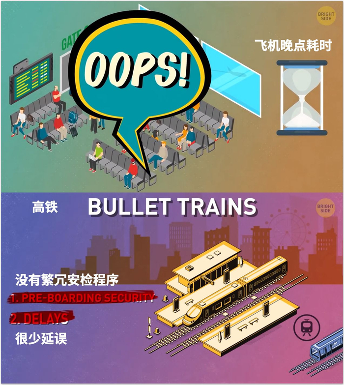 视频中指出,高铁之所以会在中国如此普及,其中一个原因便是便捷。相比于前往机场所需要消耗的路途时间,以及搭乘飞机前的安检流程和可能延误的风险,高铁车站不仅更方便旅客抵达,也不会有繁冗的安检程序和列车晚点问题。