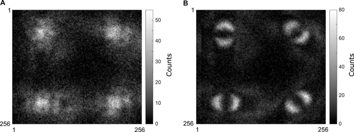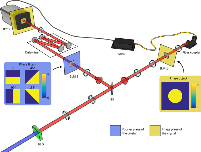 其中,光子A穿过空间光调制器1改变相位信息,经单模光纤收集后被单光子探测器探测到,触发另一路上的照相机。光子B则通过空间光调制器2后,进入一条延长线等待被拍摄。