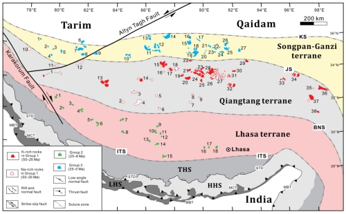 青藏高原的隆升是新生代最重要的地质事件之一,不仅影响了欧亚大陆的构造格局,还对新生代以来全球气候的变化有着深远的影响。一般认为,青藏高原的形成与印度-欧亚大陆碰撞及板块俯冲密切相关;但要弄清楚青藏高原隆升过程中地球动力学的演变过程,尚有很多关键的科学问题亟待解决,如印度大陆岩石圈能俯冲到什么深度?俯冲板片的物质对上覆地幔有何影响等?青藏高原隆升过程中的地球动力学机制是连续渐变的,还是发生过重大的转型?高原上广泛出露的碰撞后火成岩及其岩石组合被认为是探讨深部地球动力学过程的窗口,其岩石成因能对这些关键的问题提供重要的启示。