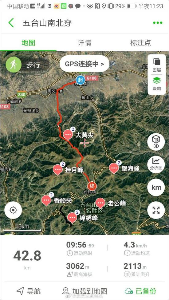 在北大未名BBS论坛中,还有和庄方东同属于北大登山社团山鹰社的校友晒出了他徒步五台山的记录,上面显示:他用9小时56分的时完成了42.8km的徒步,步数总计是72748步。