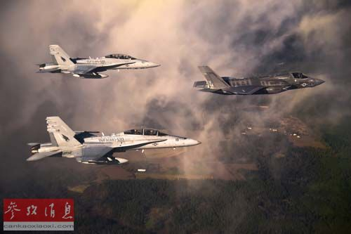 资料图:一架美国海军陆战队F-35“闪电”II型战斗机在两架F-18战斗机护航下飞行。新华社/路透