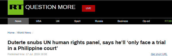 据“今日俄罗斯”(Russia Today)17日报道,菲律宾总统杜特尔特拒绝被国际刑事法院(ICC)审判,他表示,就算他因“禁毒战争”而被审判,那也必须是在菲律宾。