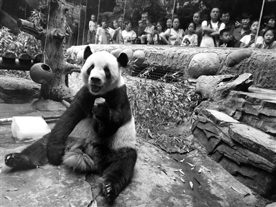 大熊猫正在享受冰块带来的清凉 摄影/本报记者 汪震龙