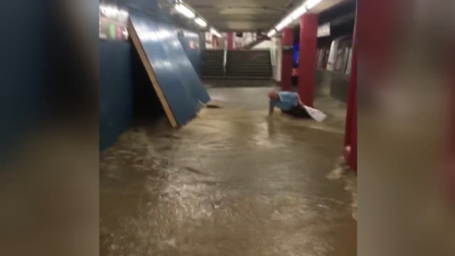 原标题:纽约暴雨后地铁站被淹,站台乘客滑倒差点被冲走