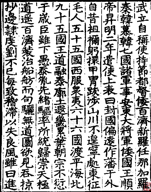 封国偏远,作藩于外,自昔祖祢,躬擐甲胄,跋涉山川,不遑宁处。东征毛人五十五国,西服众夷六十六国,渡平海北九十五国,王道融泰,廓土遐畿,累叶朝宗,不愆于岁。臣虽下愚,忝胤先绪,驱率所统,归崇天极,道遥百济,装治船舫,而句骊无道,图欲见吞,掠抄边隶,虔刘不已,每致稽滞,以失良风。虽曰进路,或通或不。臣亡考济实忿寇仇,壅塞天路,控弦百万,义声感激,方欲大举,奄丧父兄,使垂成之功,不获一篑。居在谅暗,不动兵甲,是以偃息未捷。至今欲练甲治兵,申父兄之志,义士虎贲,文武效功,白刃交前,亦所不顾。若以帝德覆载,摧此强敌,克靖方难,无替前功。窃自假开府仪同三司,其余咸各假授,以劝忠节。