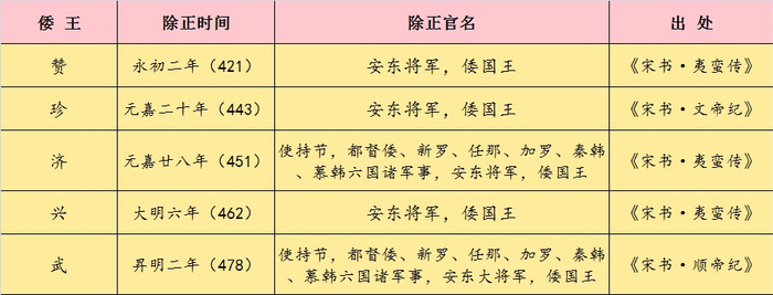 元嘉二年(425年),倭王赞派遣司马曹达进献方物,此后不久就去世了。其弟倭王珍继承王位后,又于元嘉十五年(438年)来到建康朝贡。有所不同的是,此次倭王珍不仅向宋文帝请求自身的除正,还连带了麾下的倭隋等十三人,宋文帝也答应了他的请求。倭王珍的继承人是其子倭王济,他在位时期,倭国在东亚世界的地位有了进一步的提高。元嘉二十八年(451年),第二次遣使来到建康的倭王济成功获得了宋文帝的除正,除“安东将军,倭国王”外,还得到了“使持节,都督倭、新罗、任那、加罗、秦韩、慕韩六国诸军事”的封号。换言之,倭国在此六国的军事行动一定程度上代表了刘宋王朝的意志,这对于常年与高句丽争夺朝鲜半岛的倭国而言,意义之大可想而知。