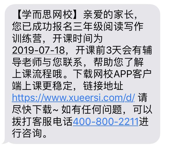 成功付款的家长,将立即收到报名成功短信,且开课前将有班主任拉您入群、随时告知课程安排,安心又贴心。