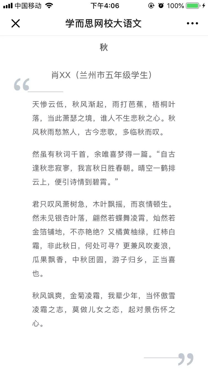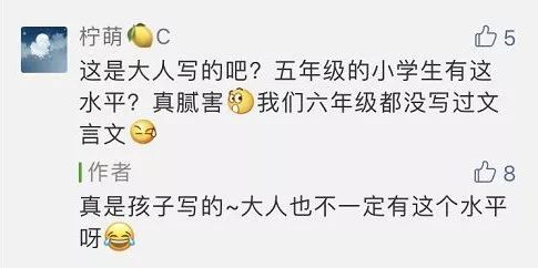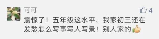 全文文笔流畅优美,文中体现出的古文造诣与意境更是让我这个大人都自愧不如。评论区家长也纷纷表示:“果然别人家的孩子从未让我失望过!”