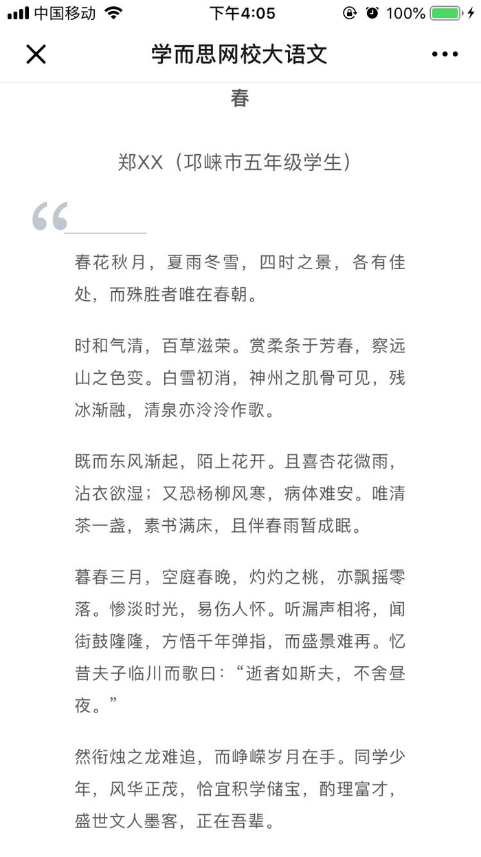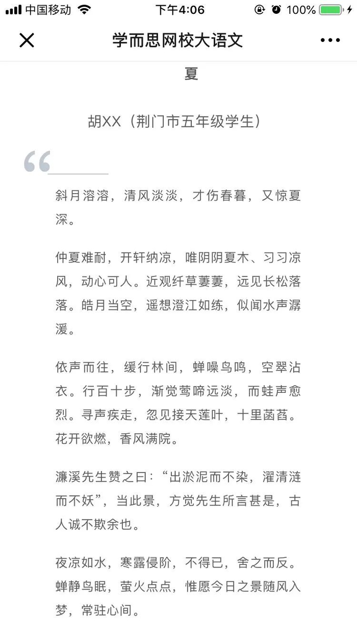 这位妈妈也告诉了我答案,他家孩子是上了学而思网校的「小初语文暑期提升班」,那里的老师大多是北大、北师大名校毕业,教作文很有一套,在他们网校的课堂上,很多孩子都能写出上面那样的文章。