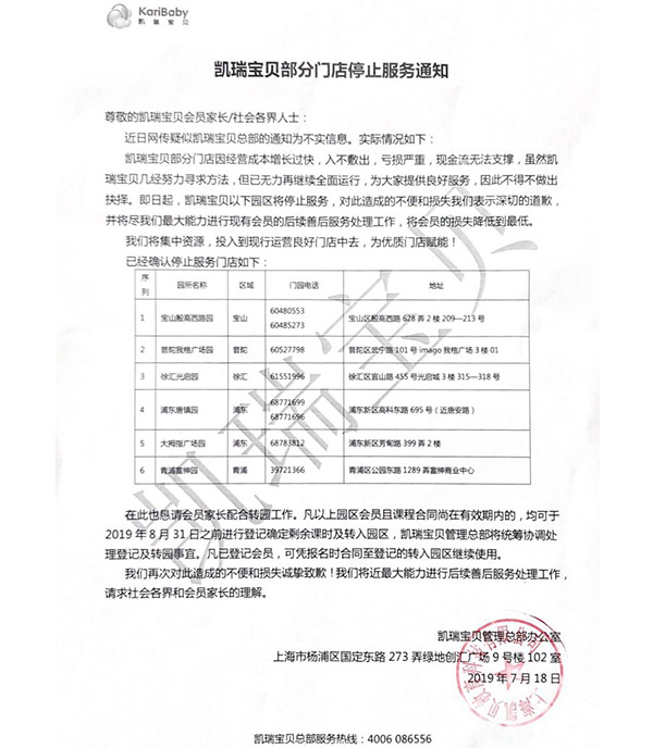 目前,毫无征兆关门的“凯瑞宝贝”已有多家。7月18日,凯瑞宝贝早教中心通过其公众号发布,已经确认停止服务门店为6家,分别为宝山殷高西路园、普陀我格广场园、徐汇光启园、浦东唐镇园、大拇指广场园和青浦富绅园。