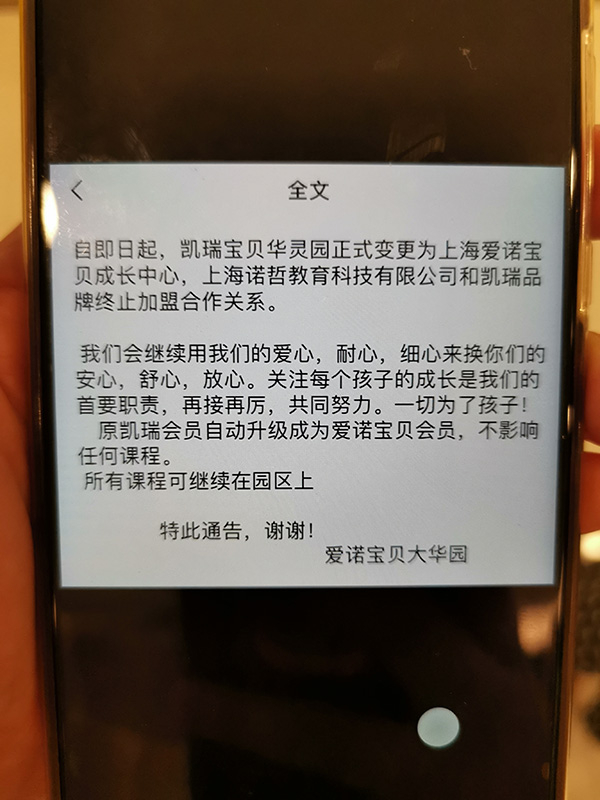 也有部分“加盟”门店开始跟“凯瑞宝贝”撇清关系。普陀我格广场园门店家长拿出手机展示,位于宝山大华的凯瑞宝贝华灵园变更为“上海爱诺宝贝成长中心”,与凯瑞品牌中止合作关系。